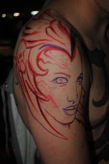 My costumer want an androgin angel on the sholder with some big wings , he brig this picture for reference , and a drawing for wings